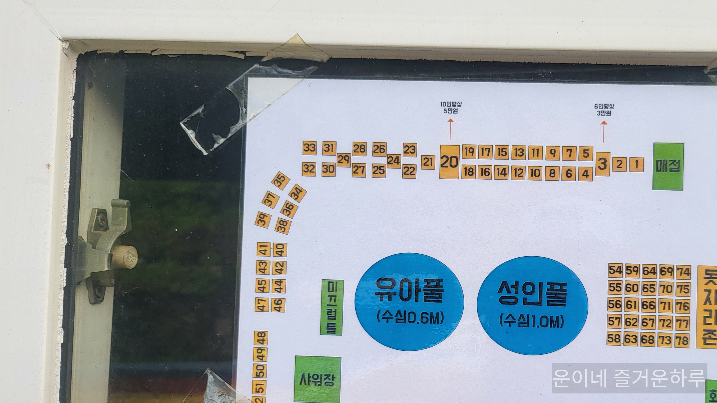 파주쇠꼴마을수영장 약도인데요. 유아풀과 성인풀로 나뉘어져있고 그 주위로 평상자리가 있습니다. 저희는 사람이 없어서 직원분이 추천해주신 25번 평상자리에 앉았는데 유아풀과 가깝고 앞쪽이라 좋더라고요.그리고 나중에 낮에보니 그늘자리라 좋았습니다.35번부터 샤워장쪽으로는 낮에는 해가 좀 드는거 같더라고요. 대신 앞에 파라솔이 있었습니다. 초등학생정도되면 유아풀과 성인풀을 왔다갔다하며 놀기에 유아풀과 성인풀이 다 볼수있는 자리가 좋은거같아요.